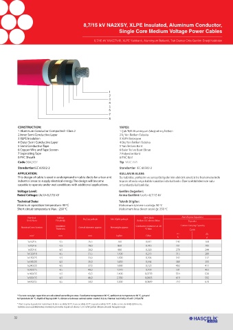 * Akım taşıma kapasiteleri maksimum iletken sıcaklığı 90 o C, hava sıcaklığı 30 o C, toprak sıcaklığı 20 o C, kablo serme derinliği 0,80 metre,
